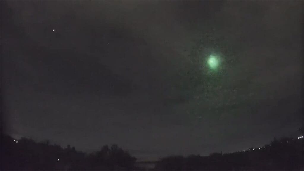 In the hours after the fireball, social media filled with clips that allowed scientists and the public to replay the event frame by frame. One of the most striking recordings came from a fixed security camera that happened to be pointed toward the sky, capturing the meteor as it streaked in from the upper right of the frame, brightened, and then burst into a saturated green flash. The video, later uploaded to a major video platform, shows the surrounding landscape briefly illuminated as if by a distant lightning strike, then returning to darkness as the glowing trail fades. That footage gave researchers a clean, unobstructed view of the object’s path and brightness, and gave everyone else a chance to see what they might have missed in real time.